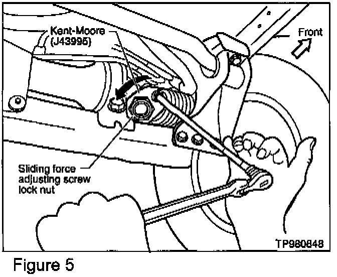 1. Use Kent-Moore tool # J43995 to loosen the sliding force adjusting screw lock nut (see Figure 5).