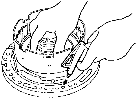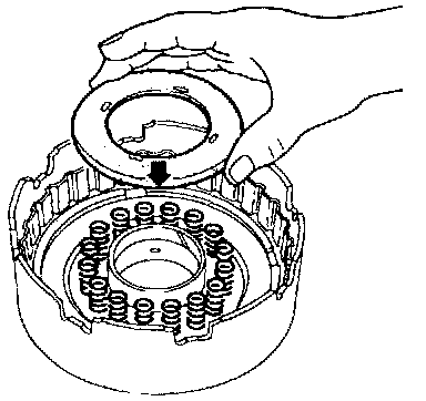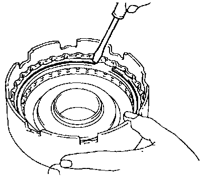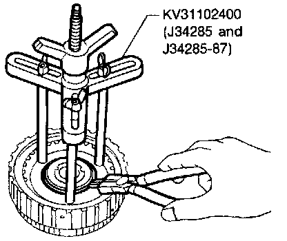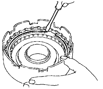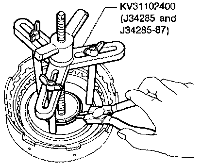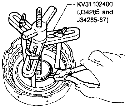 3. Remove snap ring from clutch drum while compressing clutch springs.