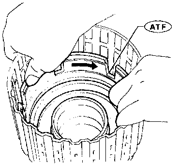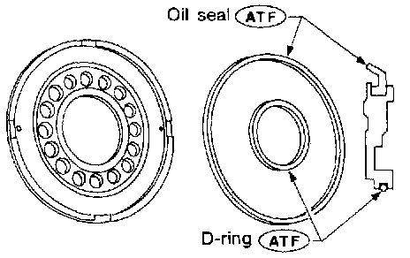 5. Install seal ring onto oil pump cover and install reverse clutch drum. While holding piston, gradually apply compressed air to oil hole until piston is removed.