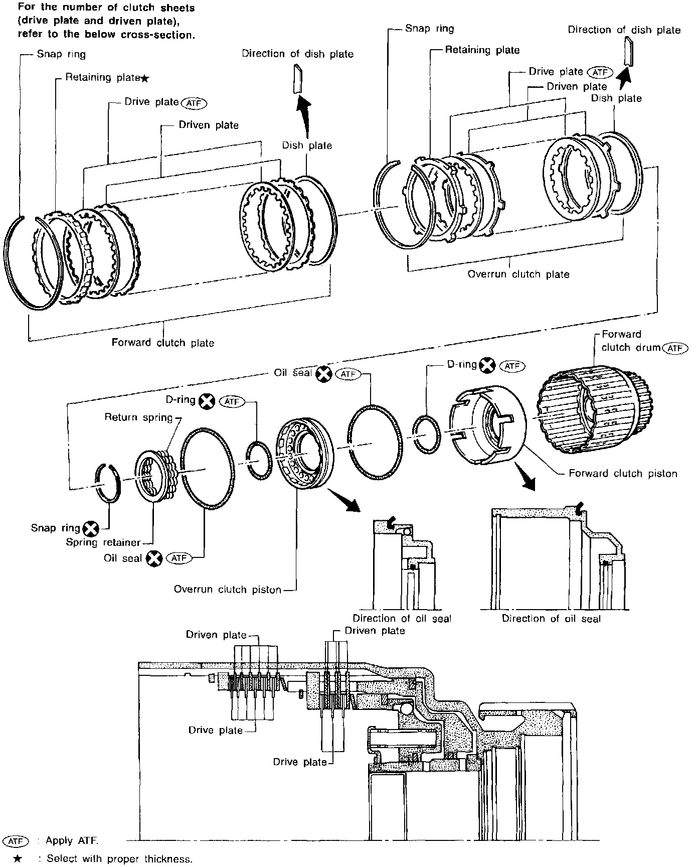 Forward and overrun clutches are serviced essentially the same way as reverse clutch is serviced. However, note the following exceptions.