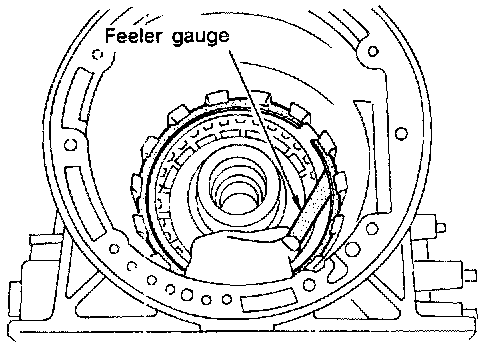 8. Measure clearance between retaining plate and snap ring. If not within allowable limit, select proper retaining plate.