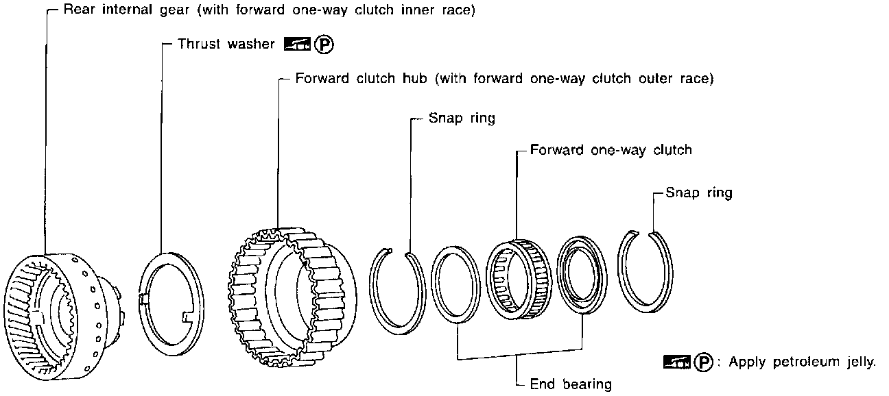 - Check frictional surfaces of forward one-way clutch and thrust washer for wear or damage.