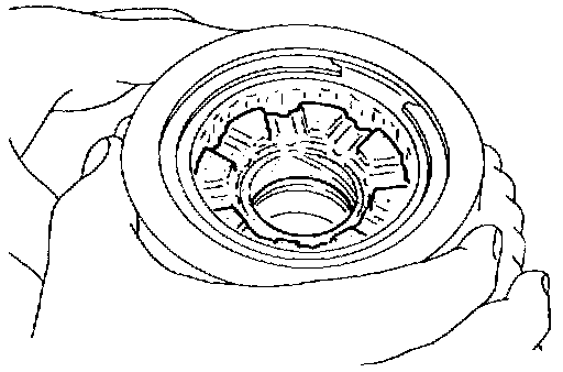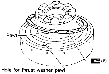 - Securely insert pawls of thrust washer into holes in rear internal gear.