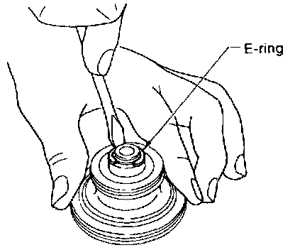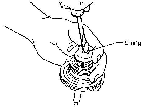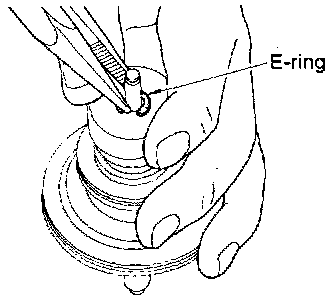 5. Place piston stem end on a wooden block. While pushing servo piston spring retainer down, remove E-ring.
