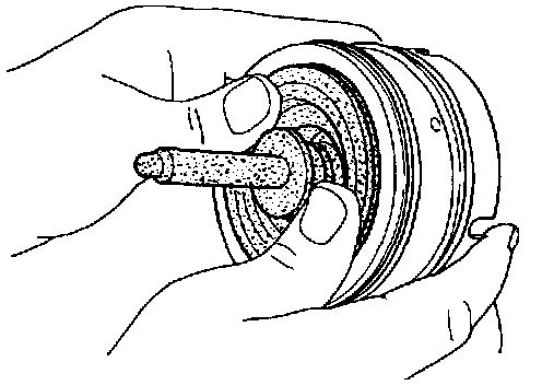 6. Place piston stem end on a wooden block. While pushing servo piston spring retainer down, install E-ring.