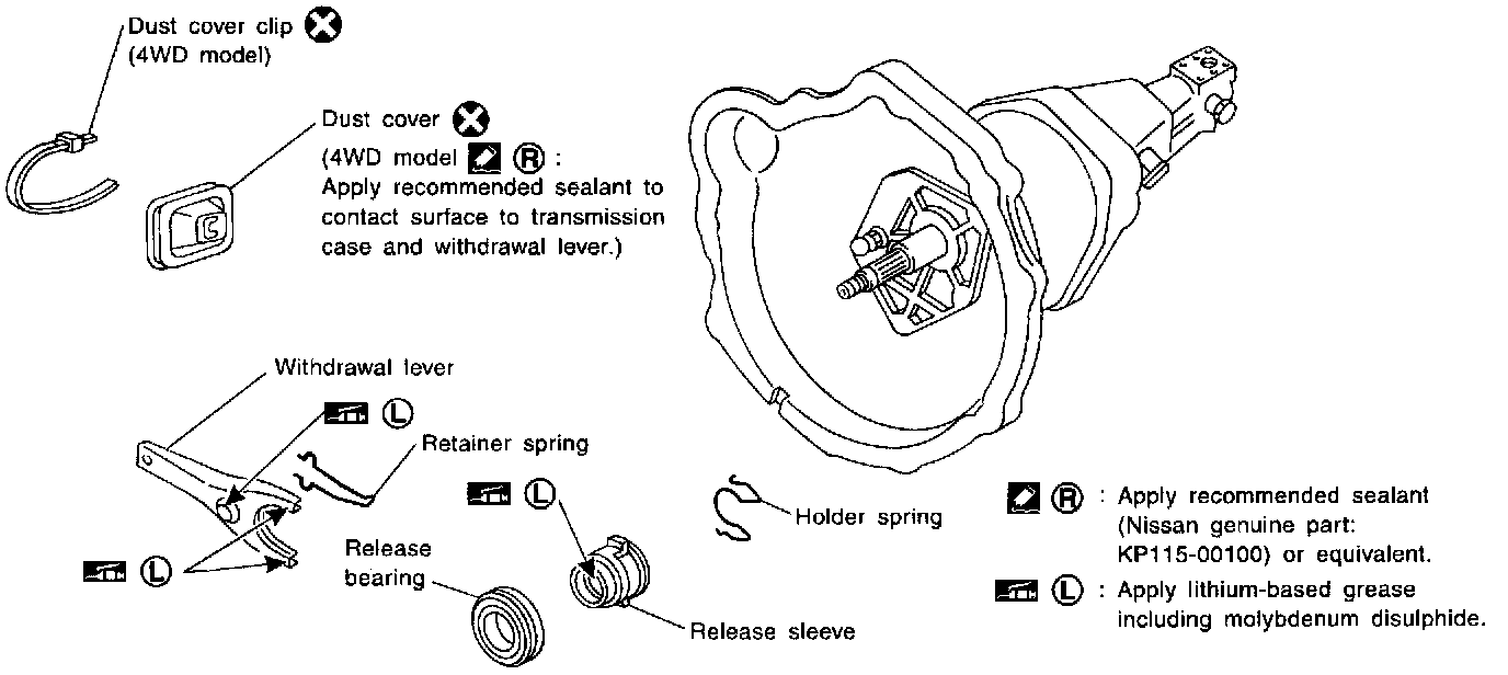 - Apply recommended sealant to contact surface of dust cover to transmission case and withdrawal lever and then install dust cover clip.
