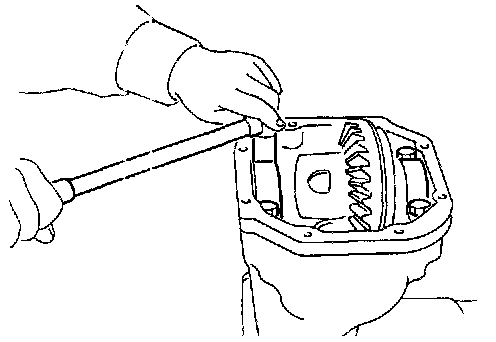 8. If the carrier turning torque is not within the specification range, increase or decrease the total thickness of the side bearing adjusting washers until the turning torque is correct. If the turning torque is less than the specified range, install washers of greater thickness; if the turning torque is greater than the specification, install thinner washers. See the SDS section for washer dimensions and part numbers.
