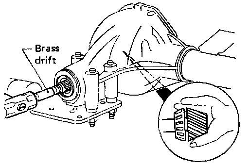 9. Take out drive pinion together with rear bearing inner cone, drive pinion bearing spacer and pinion bearing adjusting washer.
