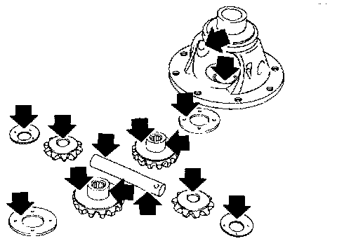 Check mating surfaces of differential case, side gears, pinion mate gears, pinion mate shaft and thrust washers.