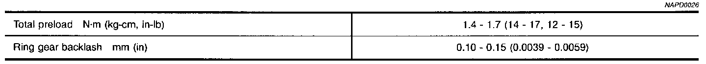Ring gear-to-drive pinion backlash: 0.10 - 0.15 mm (0.0039 - 0.0059 inch)