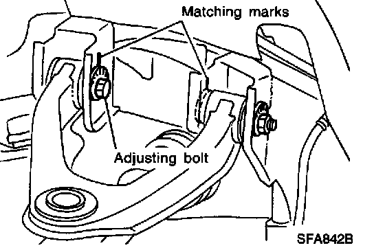 1. While aligning the adjusting bolts with the matching marks, install the upper link. If a new upper link or any other suspension part is installed, align the matching mark with the slit as indicated in the figure at the left, then install the upper link.