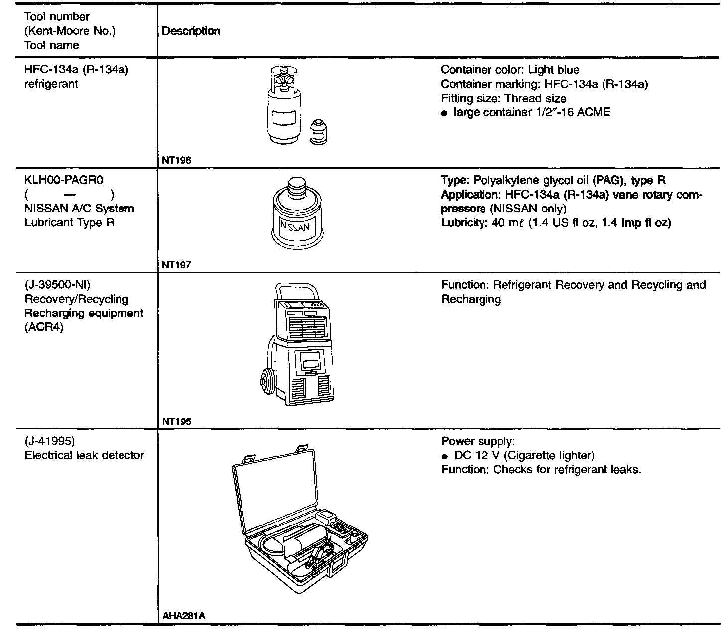 Never mix HFC-134a (R-134a) refrigerant and/or its specified lubricant with CFC-12 (R-12) refrigerant and/or its lubricant. Separate and non-interchangeable service equipment must be used for handling each type of refrigerant/lubricant. Refrigerant container fittings, service hose fittings and service equipment fittings (equipment which handles refrigerant and/or lubricant) are different between CFC-12 (R-12) and HFC-134a (R-134a). This is to avoid mixed use of the refrigerants/lubricant. Adapters that convert one size fitting to another must never be used: refrigerant/lubricant contamination will occur and compressor failure will result.