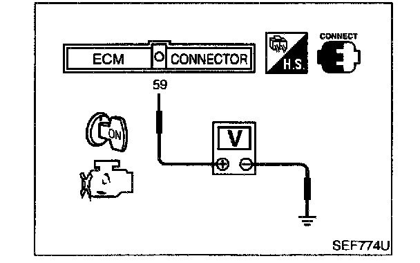 2. Check voltage between ECM terminal 59 (Engine coolant temperature sensor signal) and ground.