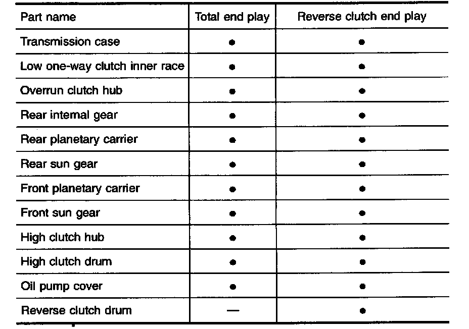 AdjustmentWhen any parts listed in the table are replaced, total end play or reverse clutch end play must be adjusted.