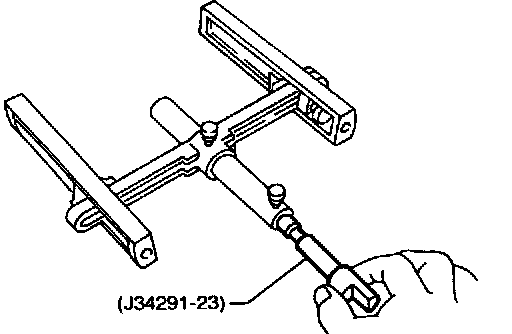 a. With needle bearing installed, place J34291-1 (bridge) J34291-2 (legs) and the J34291-5 (gauging cylinder) onto oil pump. The long ends of legs should be placed firmly on machined surface of oil pump assembly. The gauging cylinder should rest on top of the needle bearing. Lock gauging cylinder in place with set screw.