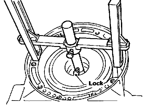 c. Install original bearing race inside reverse clutch drum. Place shim selecting gauge with its legs on machined surface of transmission case (no gasket). Allow gauging plunger to rest on bearing race. Lock gauging plunger in place with set screw.