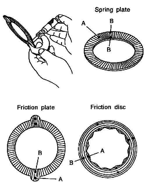 4. Measure frictional surfaces and projected portions of friction disc, friction plate, spring plate, and determine each part's differences to see if the specified wear limit has been exceeded.