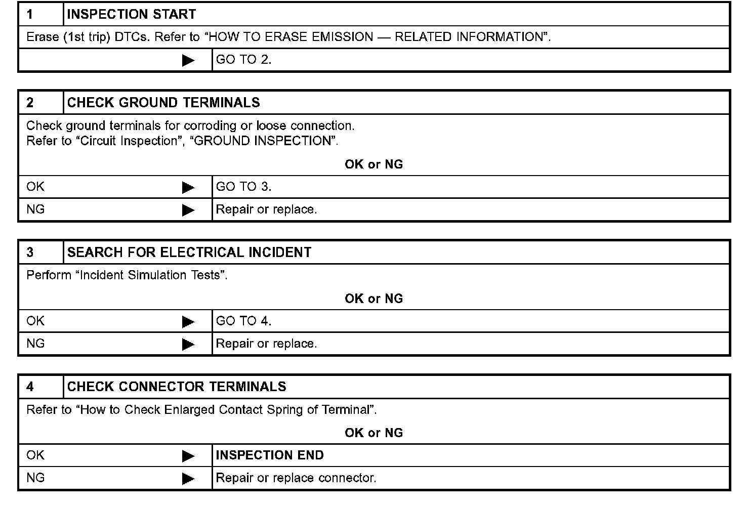 DescriptionIntermittent incidents (I/I) may occur. In many cases, the problem resolves itself (the part or circuit function returns to normal without intervention). It is important to realize that the symptoms described in the customer's complaint often do not recur on (1st trip) DTC visits. Realize also that the most frequent cause of I/I occurrences is poor electrical connections. Because of this, the conditions under which the incident occurred may not be clear. Therefore, circuit checks made as part of the standard diagnostic procedure may not indicate the specific problem area.