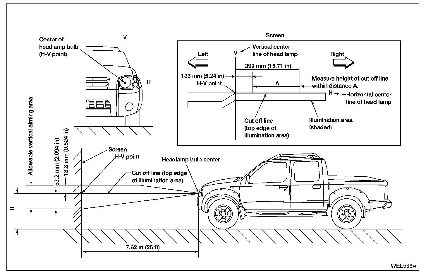- Adjust beam pattern until cut-off line (top edge of illumination area) is positioned at same height off ground as bulb center (on H-line). Measure cut-off line within distance A on H-line. See aiming chart.