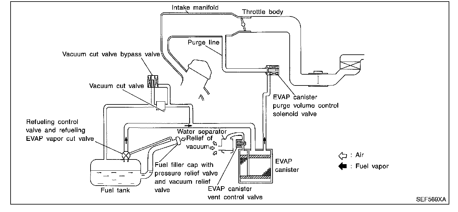 The vapor in the EVAP canister is purged by the air through the purge line to the intake manifold when the engine is operating. EVAP canister purge volume control solenoid valve is controlled by ECM. When the engine operates, the flow rate of vapor controlled by EVAP canister purge volume control solenoid valve is proportionally regulated as the air flow increases.