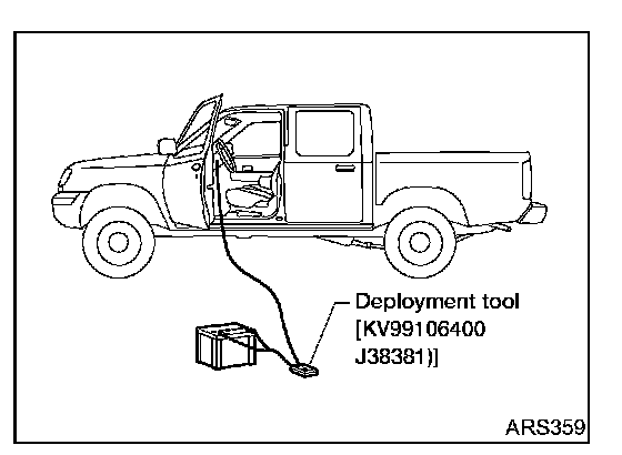 NOTE Before disposing of air bag modules and seat belt pre-tensioners, or vehicles equipped with such systems, deploy the systems. If such systems have already been deployed due to an accident, dispose of as indicated in AIR BAG MODULE AND SEAT BELT PRE-TENSIONER DISPOSAL.When deploying air bag module or seat belt pre-tensioner, always use the Special Service Tool; Deployment tool KV99106400 (Kent-Moore No. J38381).