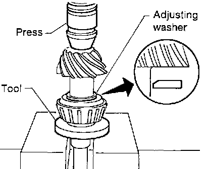 3. Install drive pinion adjusting washer in drive pinion, and press fit pinion rear bearing inner cone in it, with press and Tool.