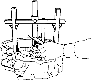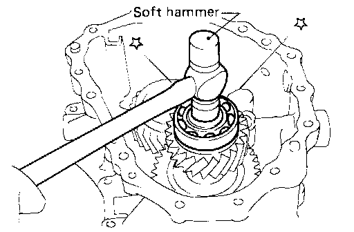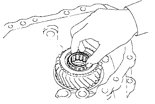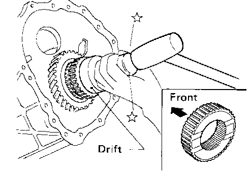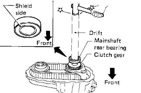 h. Install baulk ring, then install clutch gear and mainshaft rear bearing. Place wooden block under mainshaft in order to protect mainshaft front bearing.