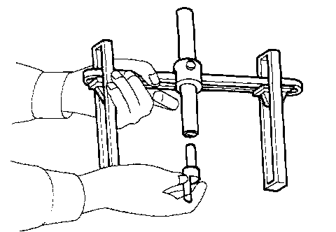 d. Place bridge, legs, gauging cylinder and gauging plunger onto machined surface of front case assembly, allowing gauging plunger to drop until it contacts counter gear rear bearing mating surface.