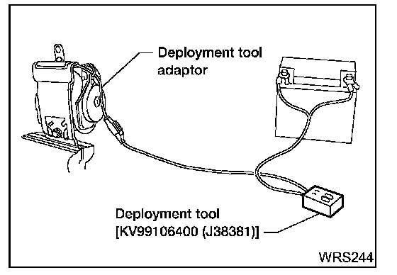 - Before disposing of air bag modules and seat belt pre-tensioners, or vehicles equipped with such systems, deploy the systems. If such systems have already been deployed due to an accident, dispose of as indicated in "DISPOSING OF AIR BAG MODULE AND SEAT BELT PRE-TENSIONER".- When deploying air bag module or seat belt pre-tensioner, always use the Special Service Tool; Deployment tool KV99106400 (Kent-Moore No. J38381).
