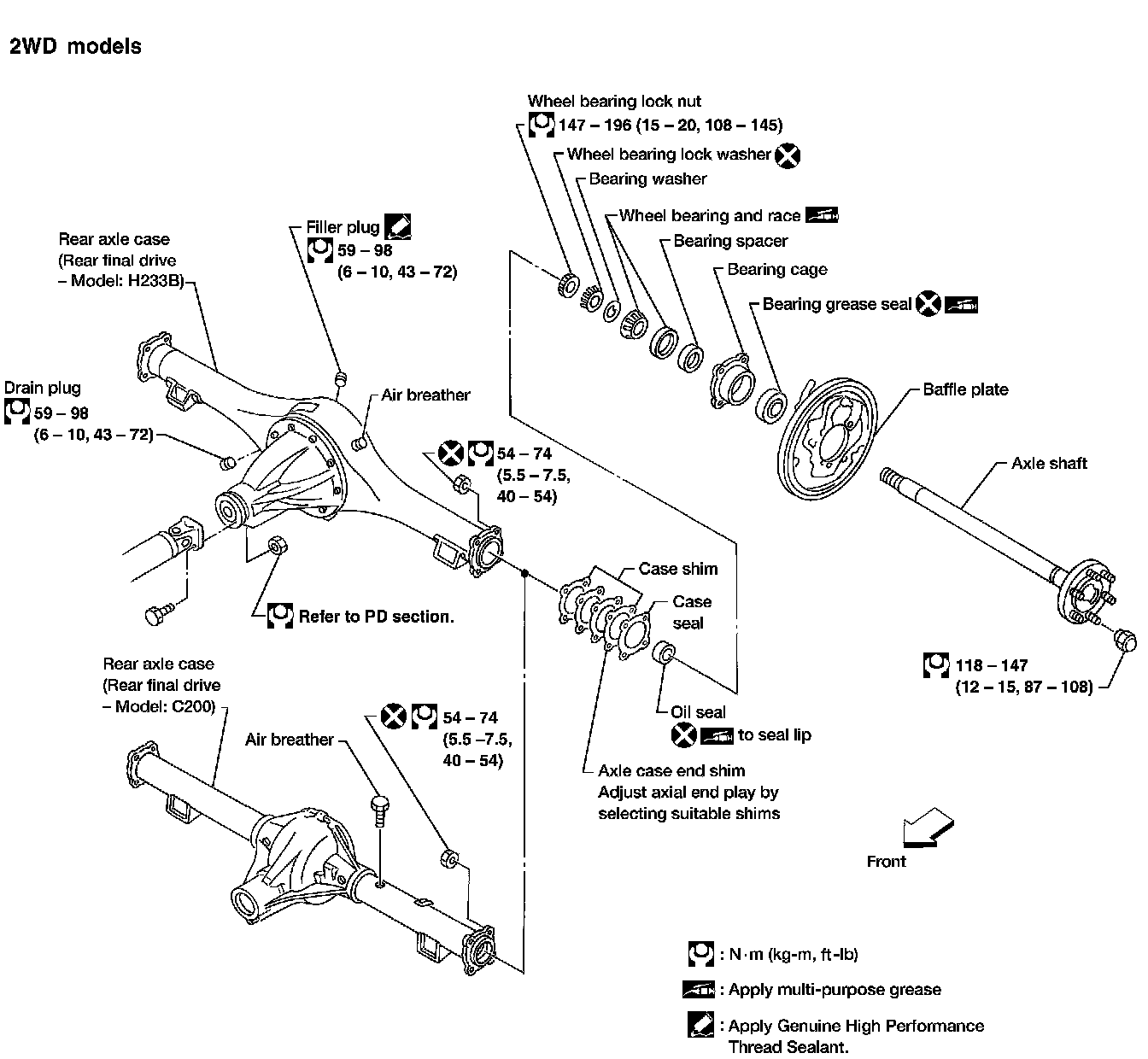 Before removing the rear axle, disconnect the ABS wheel sensor from the assembly. Then move it away from the axle. Failure to do so may result in damage to the sensor wires and the sensor becoming inoperative.
