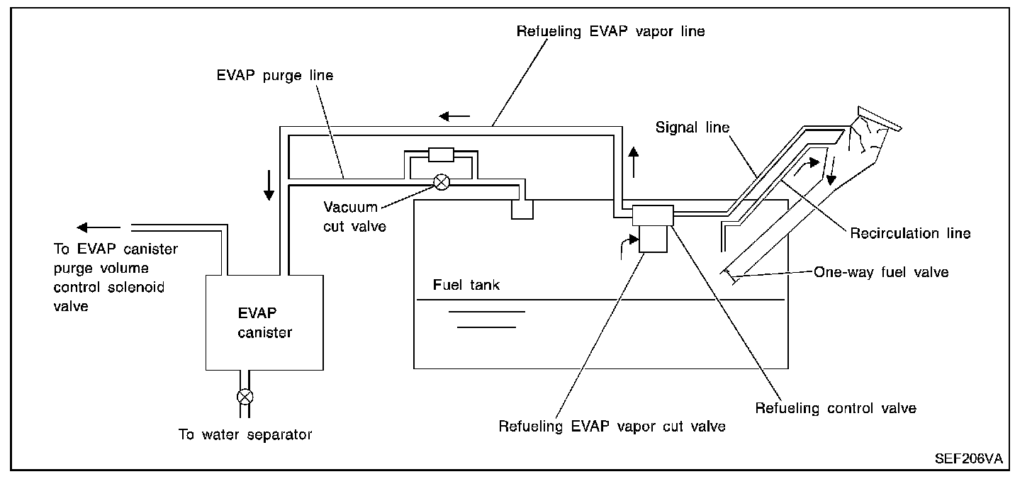 When the refueling has reached the full level of the fuel tank, the refueling EVAP vapor cut valve is closed and refueling is stopped because of auto shut-off. The vapor which was absorbed by the EVAP canister is purged during driving.