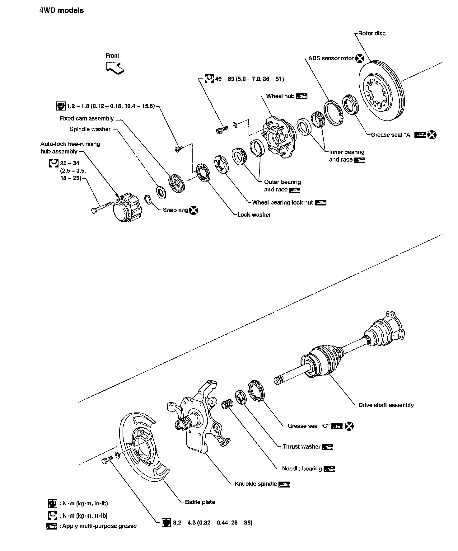 Retightening torque after loosening wheel bearing lock nut Nm (kgf-cm, ft. lbs.) 0.5 - 1.5 (0.05 - 0.15, 0.4 - 1.1)