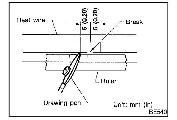 3. Place ruler on glass along broken line. Deposit conductive silver composition on break with drawing pen. Slightly overlap existing heat wire on both sides [preferably 5 mm (0.20 in)] of the break.