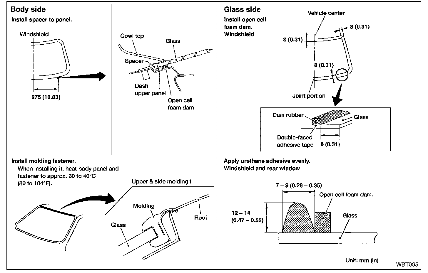 If water is leaking between urethane adhesive material and body or glass, determine the extent of leakage. This can be done by applying water to the windshield or side window area while pushing glass outward.