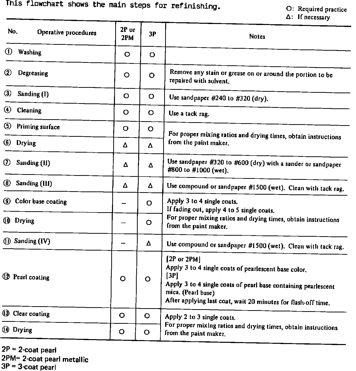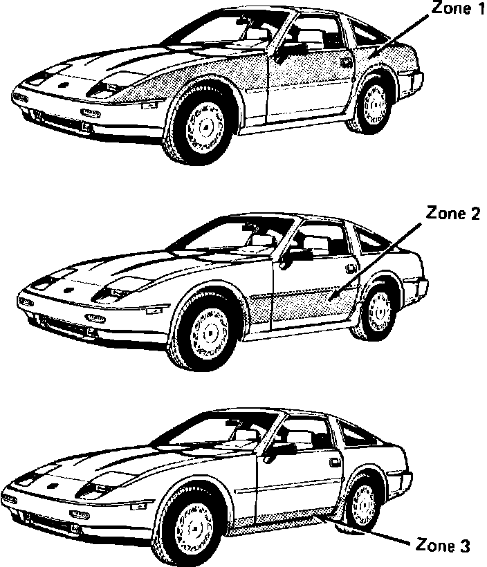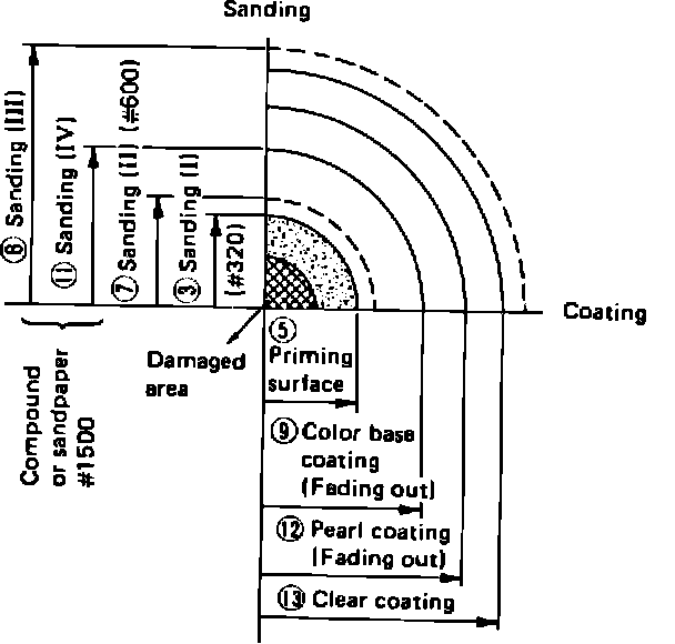 Application of 2-coat pearl and 2-coat pearl metallic is similar to that of other 2-coat metallic paints. However, repairs on 3-coat pearl require special technique and experience since color matching is much more critical. Also, when spot or partial repairing is required, the full panel or "Zone" must be repainted (see drawing).