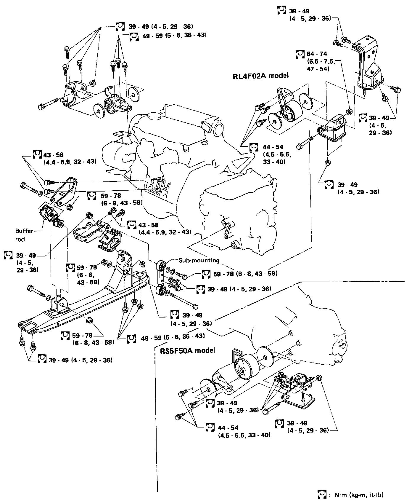 8. Reverse procedure to install. Tighten RH, LH and rear engine mount bolts first, then apply engine load to mounting insulators before tightening buffer rod and sub-mounting. Tighten bolts in numerical order, Fig. 1, when tightening buffer rod and sub-mounting.
