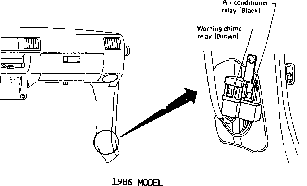 When installing air conditioning in a 1987 Stanza Wagon, note that the A/C relay location has been changed from 1986 models. The A/C relay in 1986 models was located behind the right side kick panel (Figure 1); the A/C relay in 1987 models is located on the fuse block (Figure 2).