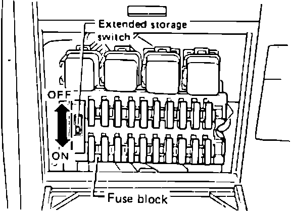 Turn on extended storage switch as shown below. The compressor unit is located at the right of the engine compartment and can be accessed from the top. Using a torque wrench and 13 mm short socket, check compressor turning torque and check for noise according to the general procedure given above. (See jumping procedure next page.) Turn off extended storage switch.