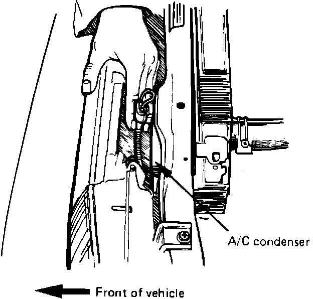 The low pressure switch must be accessed from underneath the vehicle. Place vehicle on a hoist and raise to about shoulder height. The low pressure switch connector is located at the receiver drier which is mounted in front of the radiator. (See illustration below.) Jump the harness side of the connector.
