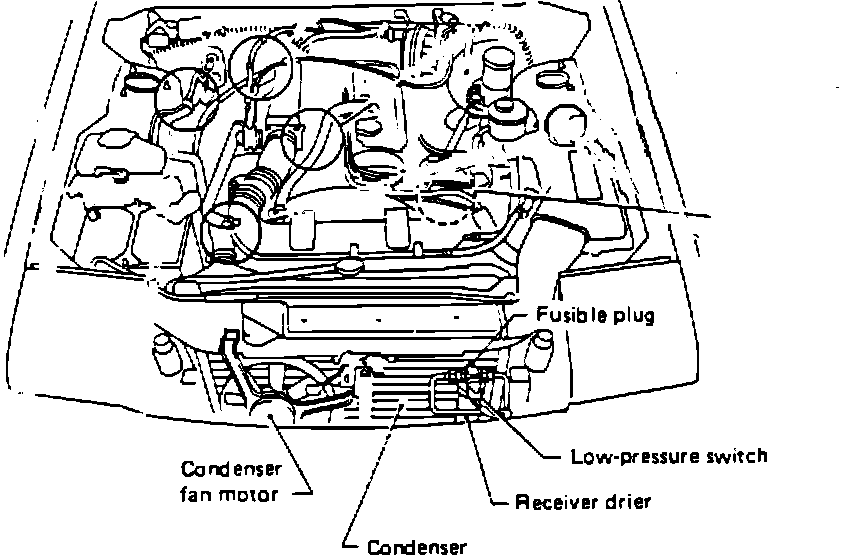 Raise engine cover to access the compressor unit which is mounted at the left side of the engine. Space is limited due to the location of the fan shroud, but the turning torque can be checked using a torque wrench and 13 mm short socket. Complete general procedure after jumping the dual pressure switch. (See instructions next page.)