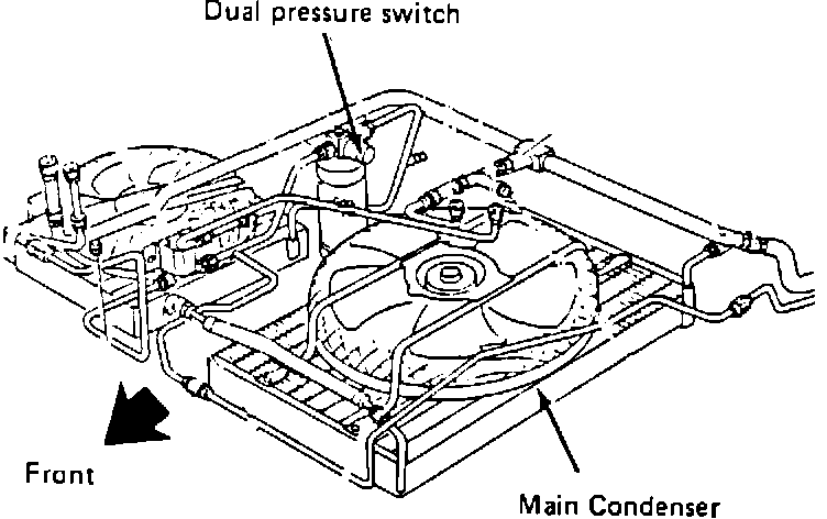 The low pressure switch must also be accessed from underneath the vehicle. Disconnect the low pressure switcn connector which is located at the receiver drier. The receiver drier is mounted in front of the radiator, lower left area. Place a jumper wire from, one side of the female connector to the other to short the switch.