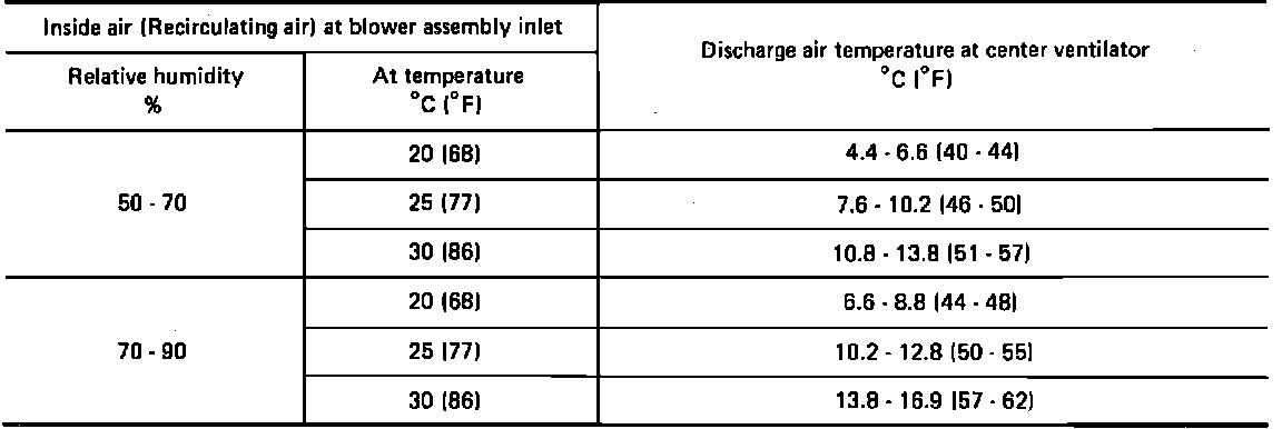 Fig. 50 A/C system performance test (recirculating-to-discharge air temperature).: