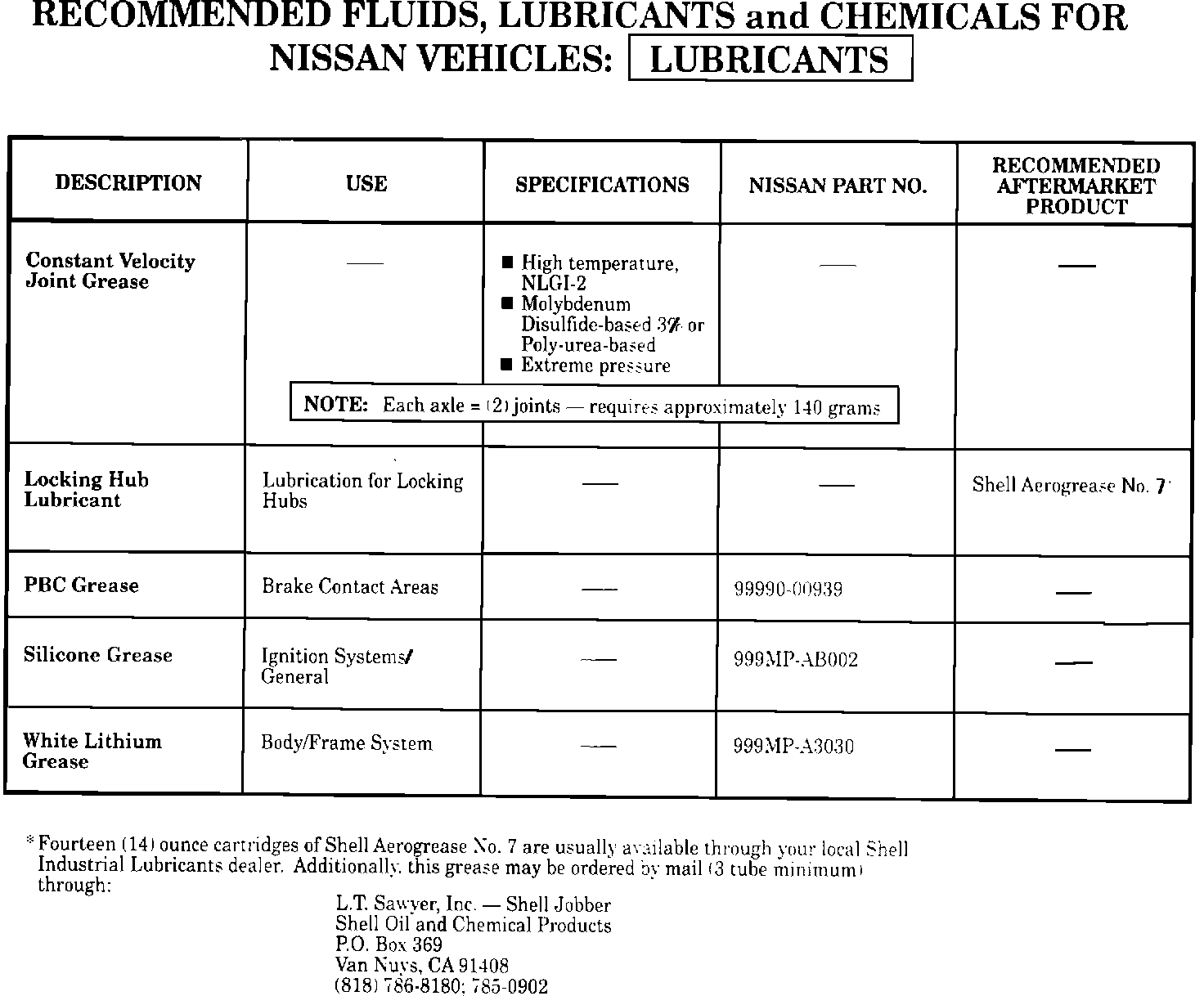 RECOMMENDED FLUIDS, LUBRICANTS, and CHEMICALS FOR NISSAN VEHICLES