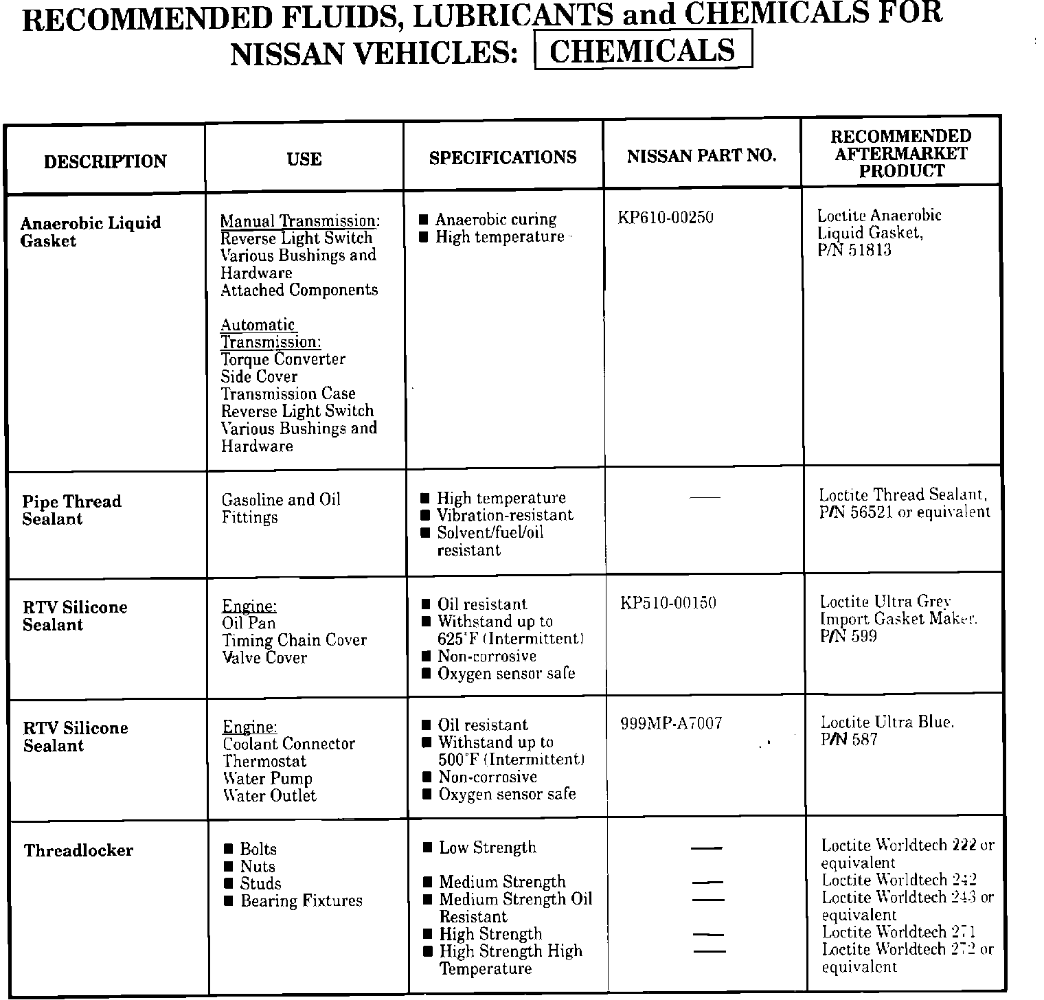 In some cases, a Non-Nissan product is referenced. However, in those cases, a chemical product has been selected which is equivalent to the Factory product in application, material compatibility, temperature-range, and solvent-resistancy.