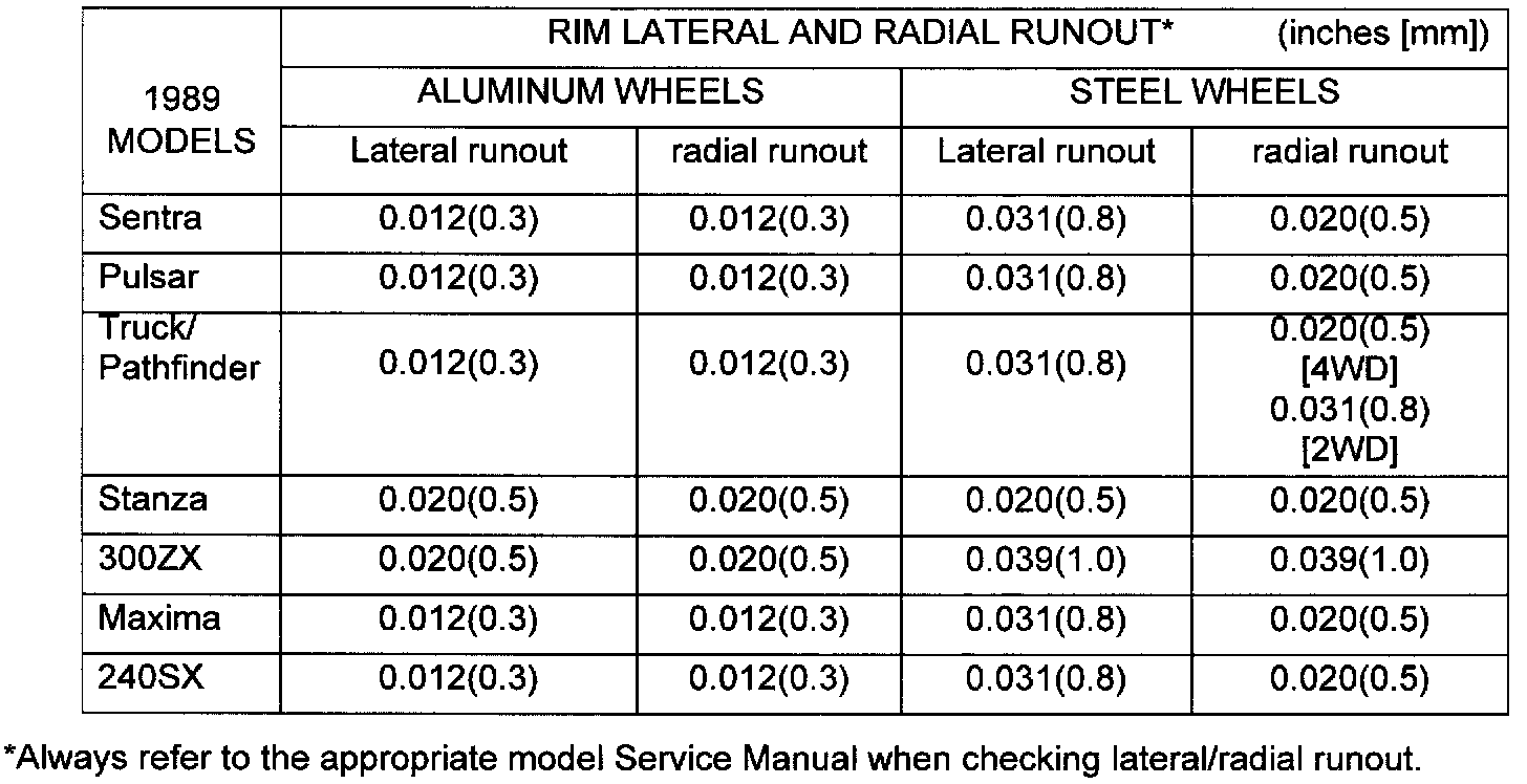 Vehicle vibration caused by an out-of-round condition will generally appear within the first 100-200 miles of driving. If it appears later, the vibration is probably caused by some other condition. Please note that more than 90% of vehicle vibration Problems are caused by conditions other than out-of-round tires.Out-of-roundness can only be measured as a radial force variation and most tire dealers do not have the equipment necessary to make this measurement. Because of this, the most effective way to inspect for this condition is to use a specific diagnostic procedure to rule out or confirm other causes for the vibration. The following pages of this Technical Bulletin contain a procedure that can be used to confirm/eliminate tire out-of-round as a cause of vehicle vibration. Listed are the lateral and radial runout specifications for the 1989 Nissan models to assist you when performing the procedure.