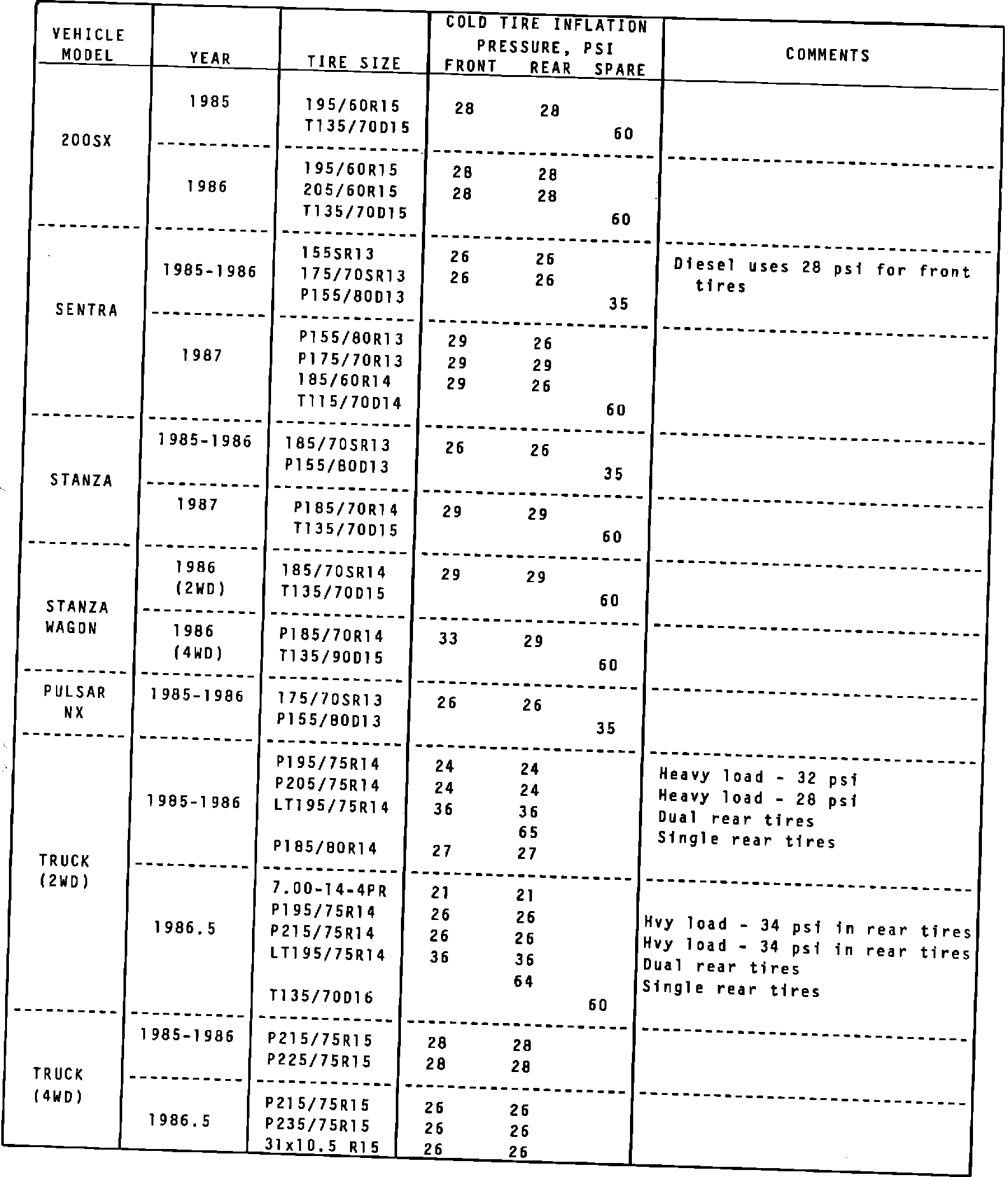 A tire will normally lose between 1/2 and 2 psi per month. For optimum tread wear, tire performance and fuel economy, tire pressure should be checked at least once every month. A tire size and pressure application chart for 1985, 1986 and some 1987 Nissan models is included on pages WT-10 and -11.