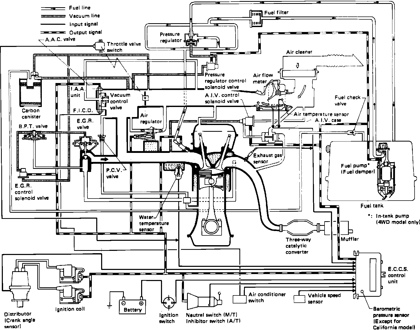 The Electronic Concentrated Engine Control System (ECCS), incorporates Bosch L-Jetronic Fuel Injection (EFI) and employs a micro-computer within the control unit. This micro-computer controls fuel injection, spark timing, exhaust gas recirculation (EGR), idle speed, fuel pump operation, air controls, and mixture ratio feedback. The micro-computer processes incoming signal data from engine and vehicle sensors and computes signal combinations to be sent to the electrical actuators.