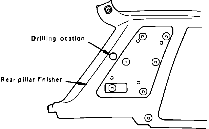 4. The rear pillar finisher requires trimming/drilling to provide access for the 3-point belt. The belt access hole is factory pre-scribed and is illustrated below. Cut the area as indicated.