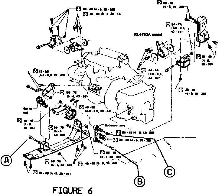 19. Remove the 5 engine crossmember mounts (3 bolts, 2 nuts), using a 14 mm socket.