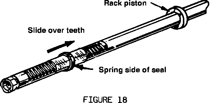 2. Carefully slide the film and seal onto the rack, while keeping the oil seal at the middle of the film and the spring-side of the seal toward the rack piston (Figure 18). After the seal and film have passed over the rack teeth, slide the seal off the film. Coat the outside of the oil seal with ATF.